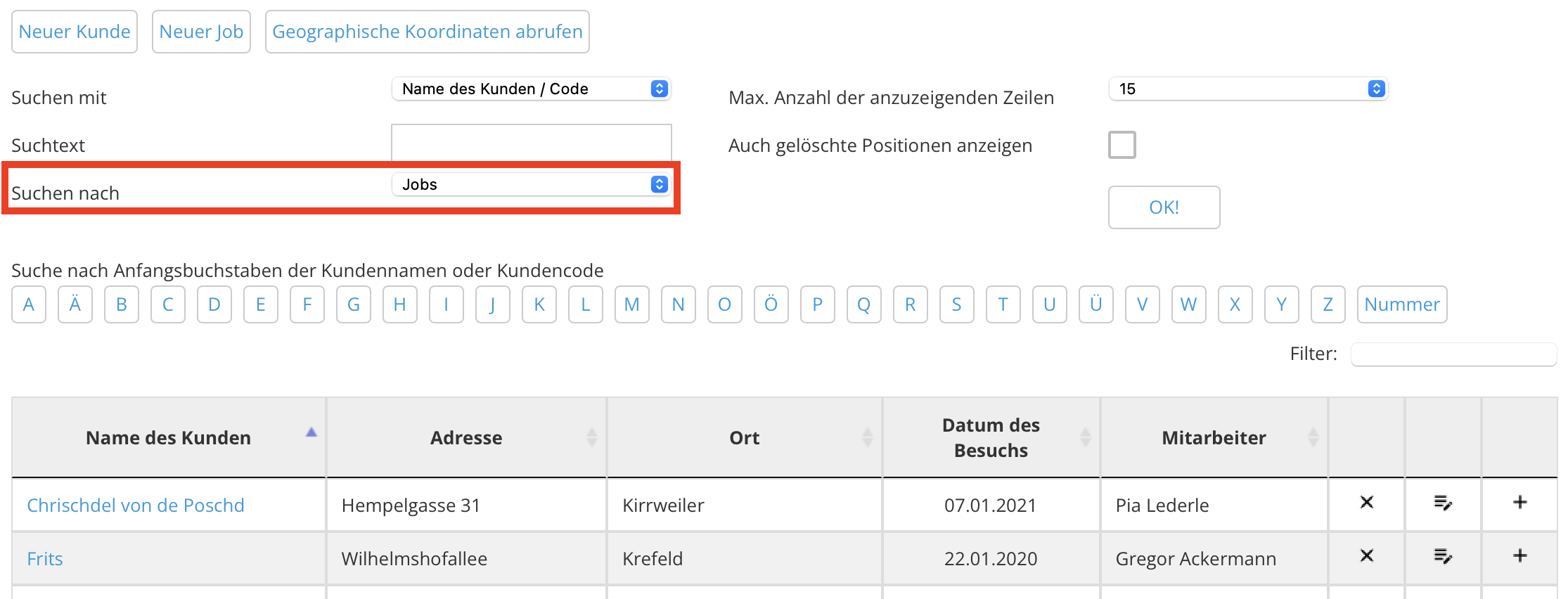 - Hinweis: Bei der späteren Suche nach einem Job funktioniert die Suche nach Kundennamen nur, wenn Sie zuvor die Option „Suchen nach: Jobs“ auswählen.