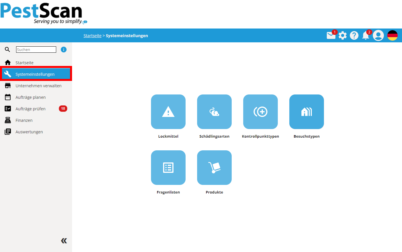 Bevor Sie mit PestScan arbeiten können, müssen Sie erst das System nach Ihren Vorstellungen einstellen und Ihr Unternehmen einrichten.