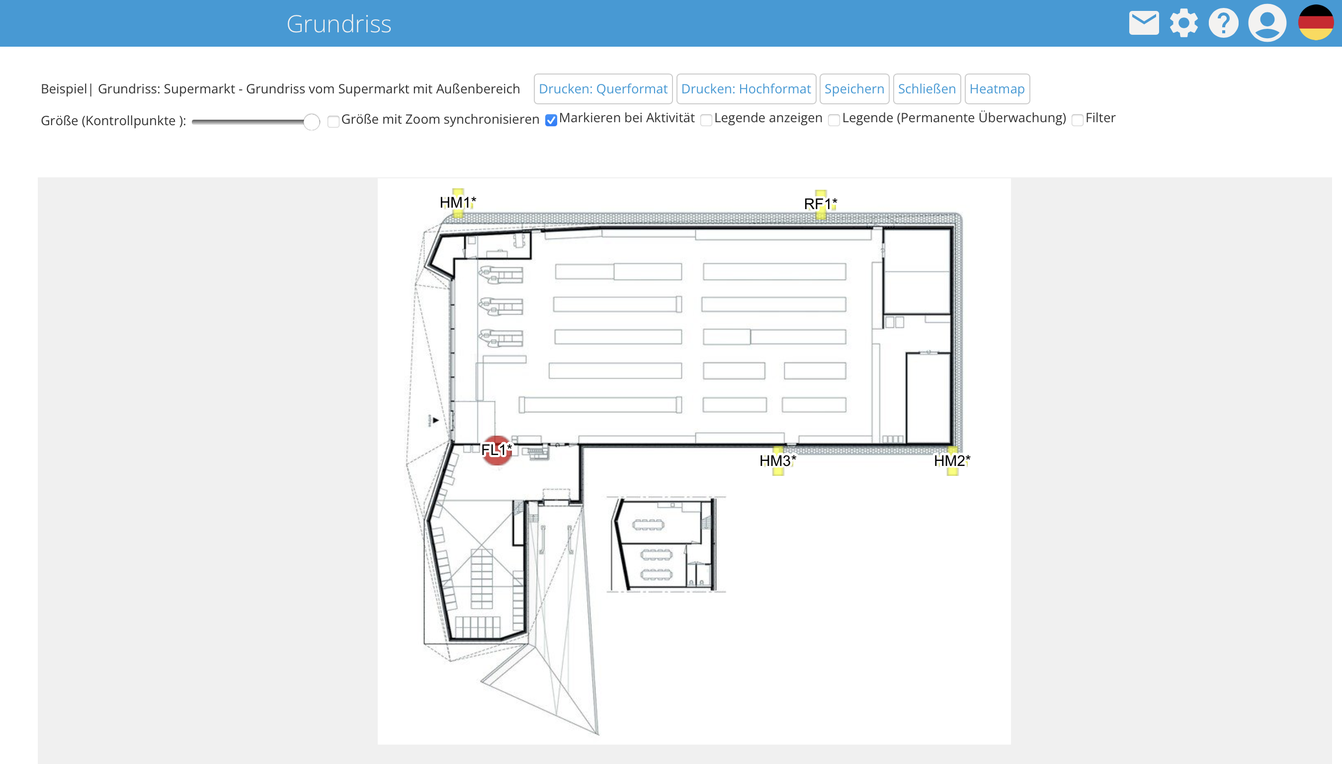 Sie können einen Kontrollpunkt aus dem Grundriss entfernen, indem Sie den Kontrollpunkt auswählen und dann auf die Schaltfläche Station löschen oben rechts klicken. Dadurch wird der Kontrollpunkt nur aus dem Grundriss und nicht aus dem System entfernt. Er erscheint dann wieder in der Liste der nicht platzierten Kontrollpunkte auf der linken Seite des Grundrisses.