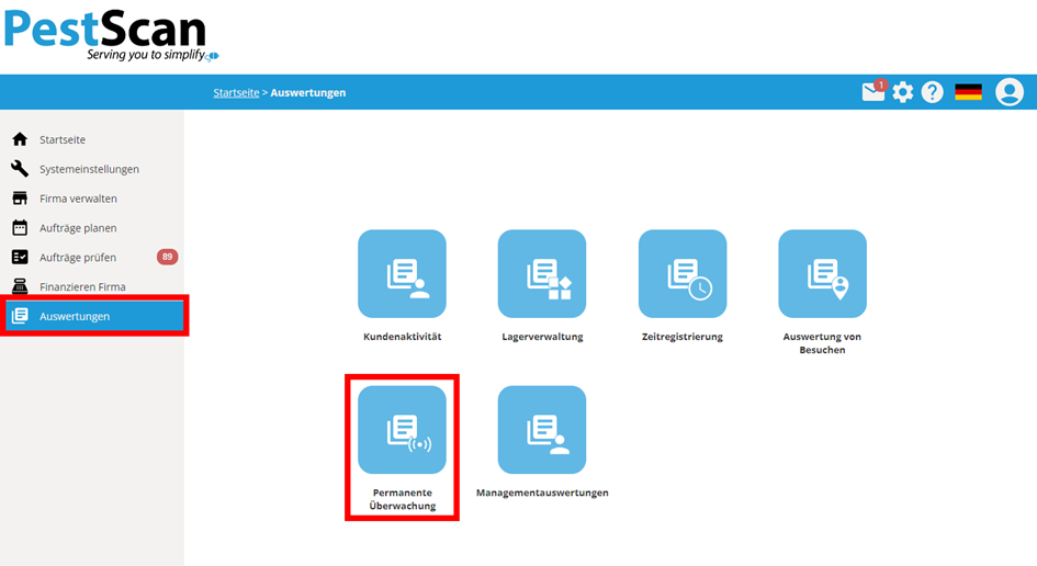 Klicken Sie in PestScan oben rechts auf das Zahnrad, um zu den allgemeinen Einstellungen zu gelangen. Klicken Sie dort oben auf Permanente Überwachung.